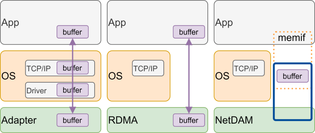 本质上它们最大的问题就像AWS写SRD的时候谈到的:其实很多时候延迟不是个事,吞吐才是最重要的,需要去做取舍。从体系结构上看,NanoPU和NetDIMM都看到了PCIe作为通路上的瓶颈,于是一个直接把网卡怼到CPU上,另一个直接把网卡怼到内存上试图降低延迟,但事实上两者都无法解决内存带宽瓶颈。而解决瓶颈的最关键技术就是隔离DMA的内存和主内存,让CPU可控的去访问I/O内存和主内存,并将I/O内存映射到用户态,这样从上到下连最后一次DMA带来的主内存memory copy都省了: