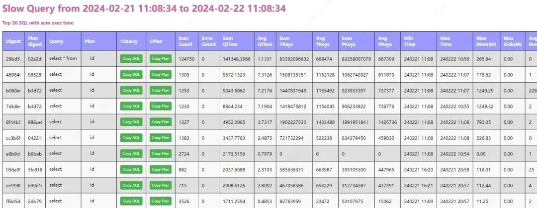 此脚本用于生成 HTML 格式的慢日志分析结果,结合定时任务和 Nginx 的自动索引功能,可以轻松地收集和查看各个 TiDB 集群的慢日志。
