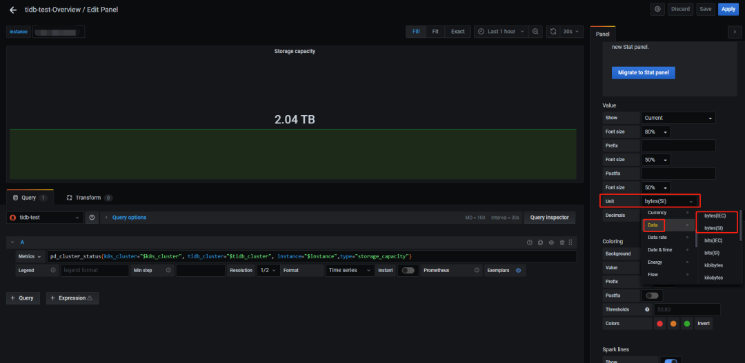 但 Grafana 中不同面板对 byte(SI) 和 byte(IEC) 的使用不一,如 TiDB 内存面板用十进制,System Info 用二进制,使用时应留意单位差异。