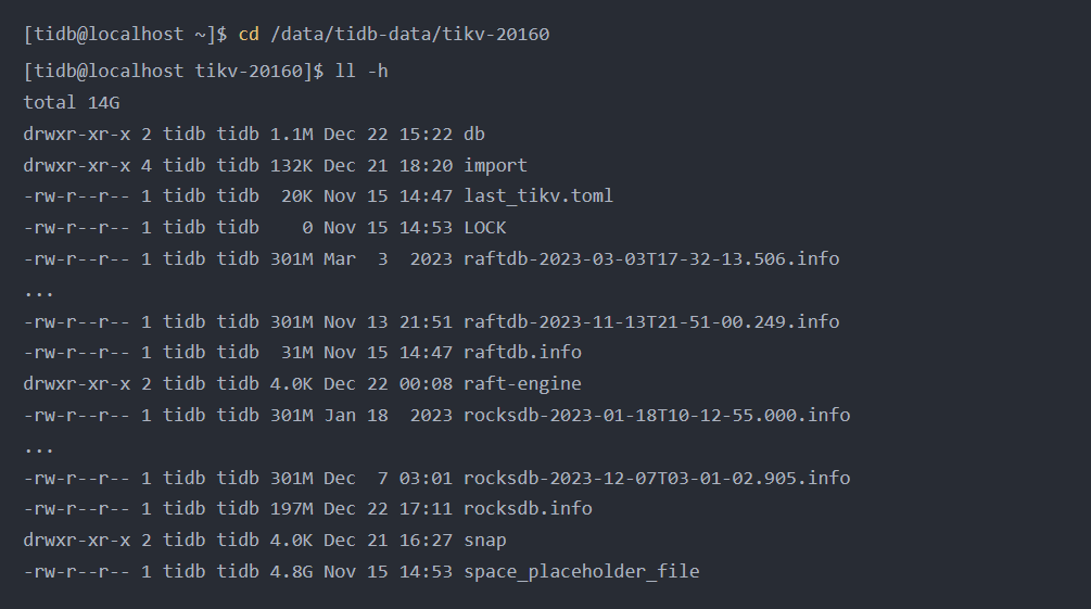 要理解 TiKV 的已用空间计算,需先了解其数据文件。TiKV 使用 RocksDB 作为存储层,其中 raft 日志和实际数据各对应一个 RocksDB 实例。需查看 TiKV 数据目录的内容。以前面的集群为例: