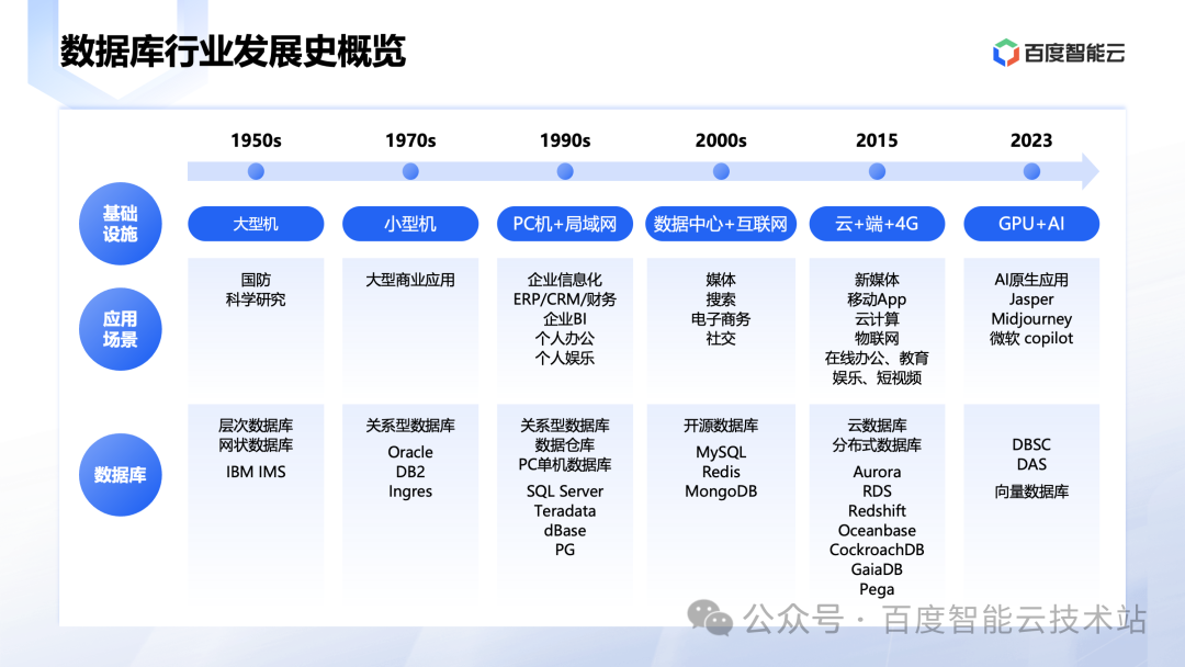 但是我们会看到在过去的 70 年里面,从最早的大型机再演变到后面的小型机,PC 服务器,数据中心 + 互联网,云,以及现在的 AI 时代。数据库在不停地演变和革新,每隔一段时间,新的硬件,新的应用就会催生新的数据库技术。