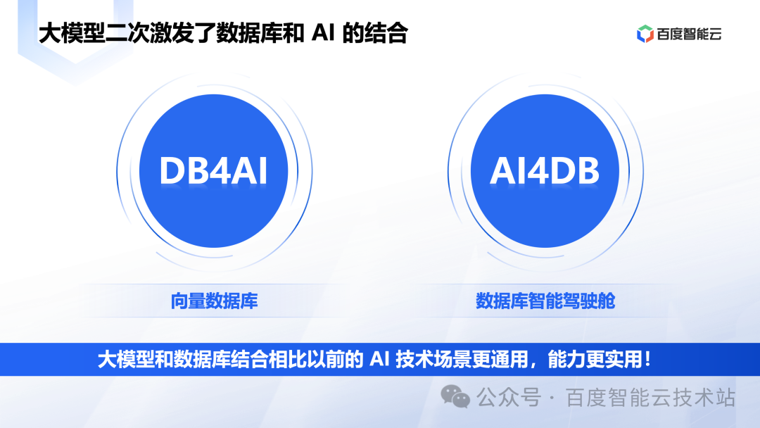 这和以往 AI 还是有本质的提升,大模型和数据库的结合相比以前的 AI 技术,让场景更通用、能力更实用。所以说大模型二次激发了数据库和 AI 结合的浪潮。