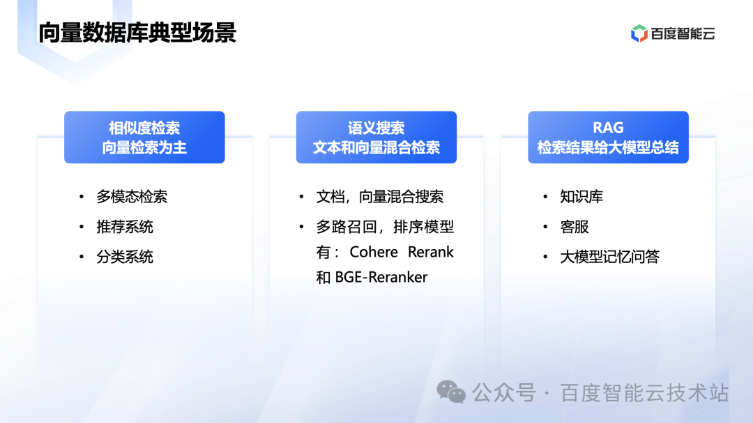 首先是相似度检索,这个场景以向量检索能力为主。主要应用在多模态检索,推荐系统,分类系统里面。这些内容,熟悉的同学肯定立马反应过来在互联网里面电商等,政企里面公安等场景广泛有应用。 第二个是语义检索,这个应用到文本和向量的混合检索,需要用到多路召回的能力,有语义排序模型一起。主要是企业内部搜索场景。 第三个是现在比较火的 RAG 场景,RAG 是检索增强生成技术,利用到向量加持大模型,让大模型给出的结果更准确,主要应用各类知识库,客服,大模型记忆问答场景。