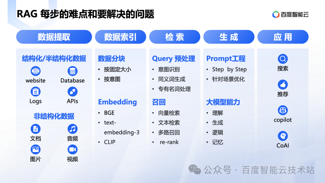 但是要做好 RAG 要经过数据提取、数据索引、检索、生成四个阶段,每个阶段都有不少难点。我这里简单提一下给大家做参考: