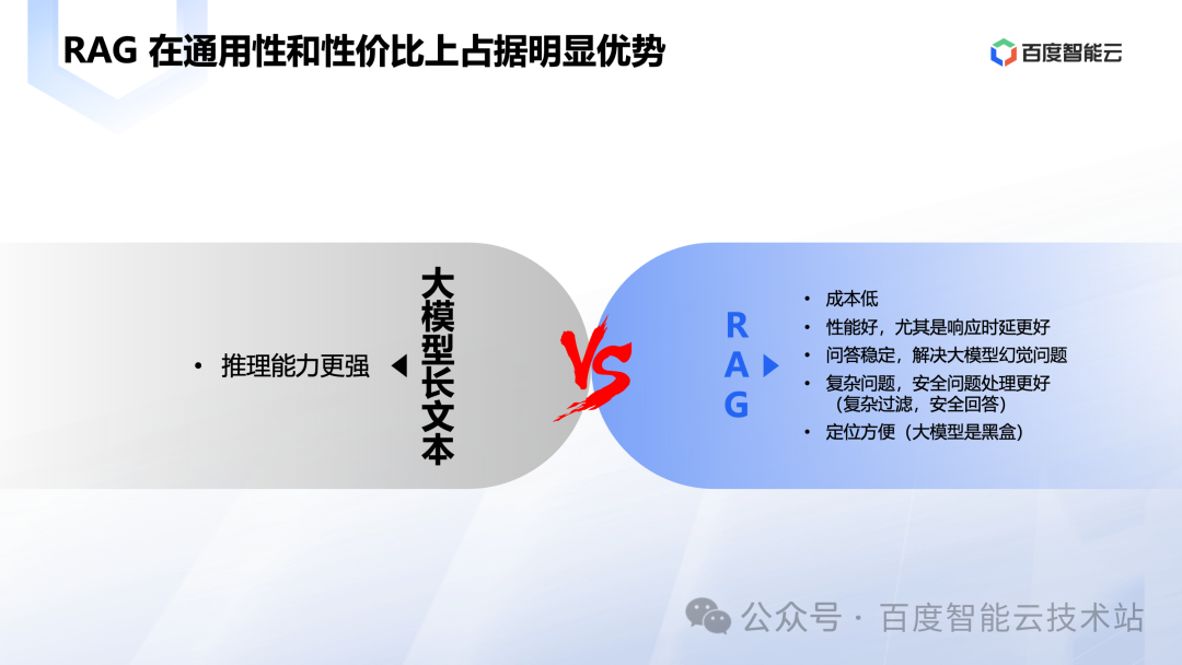 成本更低,VectorDB 运算用的资源是 CPU,大模型是用 GPU 的,两者性价比差很远。 性能好,尤其是响应的时延更好,这也是机制决定的,用过大模型的就是知道,大模型响应时延瓶颈还是比较大。 问答稳定,数据库召回的每次结果都是稳定的,大模型回答存在随机性,还有幻觉问题。 复杂问题解决的更好,比如安全问题涉及到复杂过滤,在 RAG 里面都可以有很好的解决方案,而大模型会比较难解决。 定位问题方便,大模型还是黑盒,而 RAG 方案,整个过程都是可以追溯和分析的,可以更好的改进 corner case。
