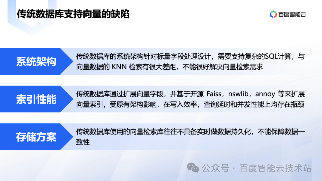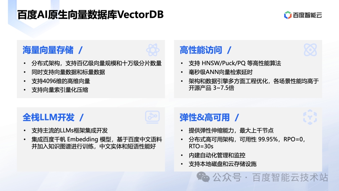 我们在实践中看到这些问题,因此我们全新自研了百度智能云 AI 原生向量数据库 VectorDB。主要的特点有四个方面