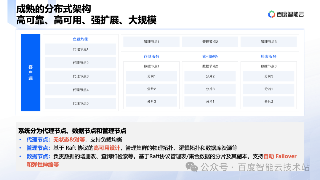 首先是成熟的分布式架构。向量还是一个偏 NoSQL 的场景,企业内部的数据可大,可小。所以我们利用原来多年积累的存储,数据库分布式经验,在系统的每一层都是可以扩展的: