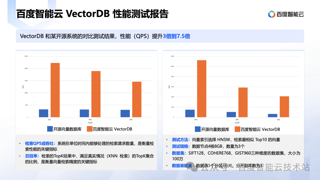 前面讲的核心机制,现在看看 VectorDB 和开源的对比。我们在相同的召回率条件下,整个 QPS 或者吞吐超越开源 3~7.5 倍。关于这个测试报告,大家可以在我们的VectorDB 产品官网帮助中找到测试的规格、数据、测试代码,整个测试是可以复现。