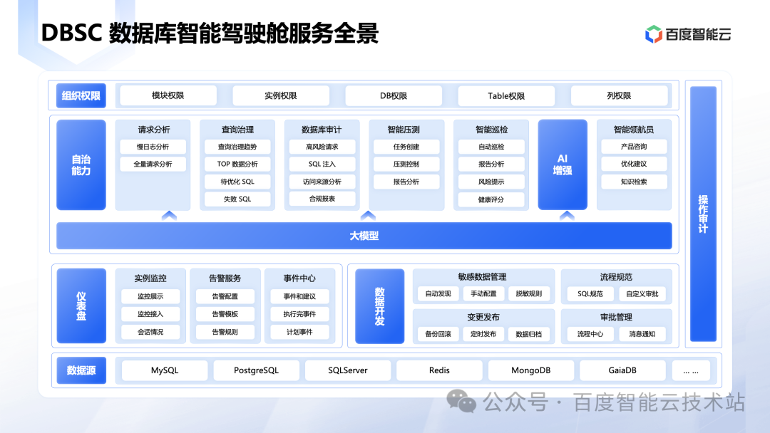 我们的产品叫 DBSC,中文是数据库智能驾驶舱。先用一张图来看下我们的数据库智能驾驶舱的能力全景。
