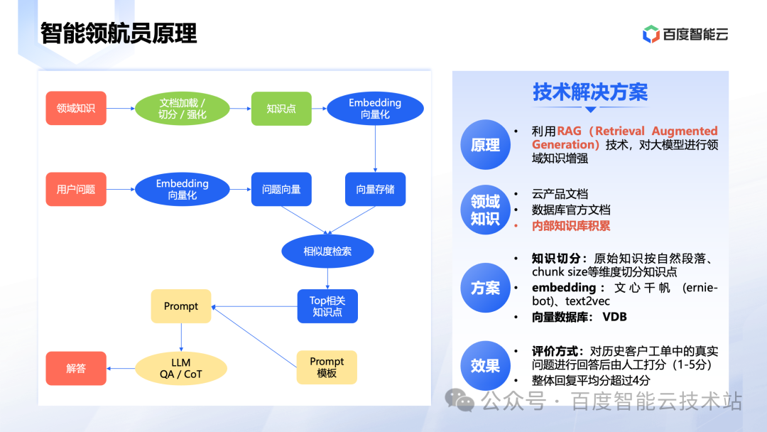 智能领航员技术上简单说一下,就是用的 RAG 技术,embedding 模型用的文心千帆的 text 模型,向量数据库用的 VectorDB。用 VectorDB 存储积累的大量专业知识,所以用户使用下来,效果非常不错,根据我们的测试满意度 80% 以上。