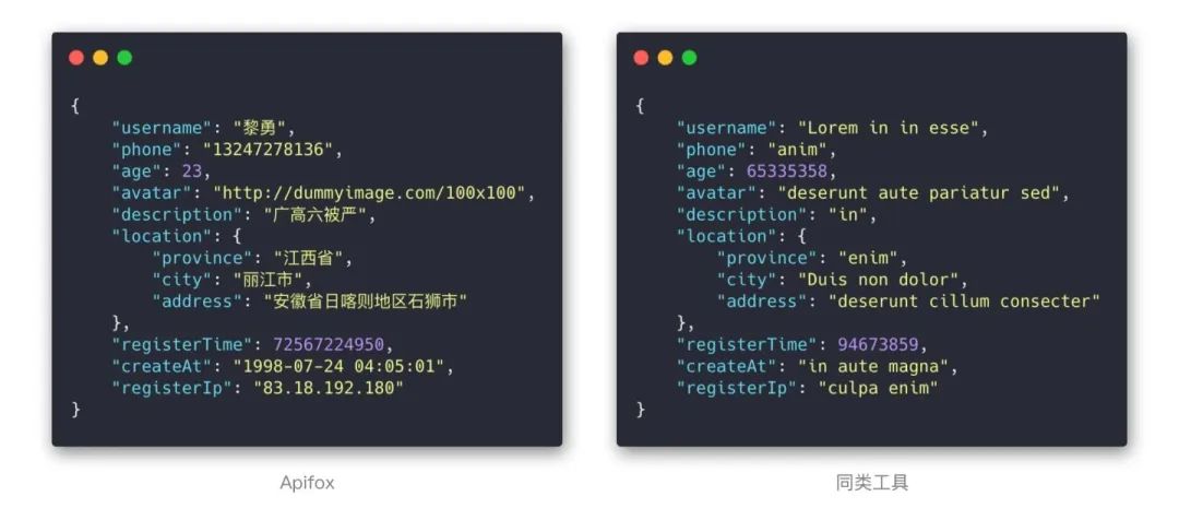 类型字段,自动 mock 出一个城市名。Apifox 根据内置规则,可自动识别出图片、头像、用户名、手机号、网址、日期、时间、时间戳、邮箱、省份、城市、地址、IP等字段,从而 Mock 出非常人性化的数据。 除了内置 mock 规则,用户还可以自定义规则库,满足各种个性化需求。支持使用 正则表达式