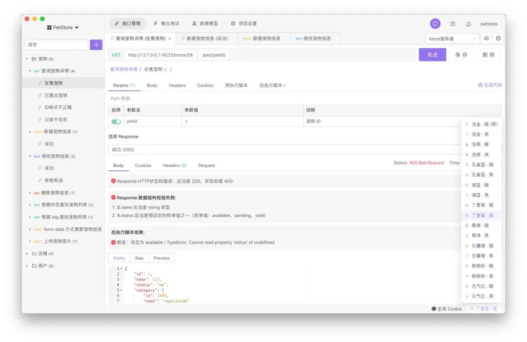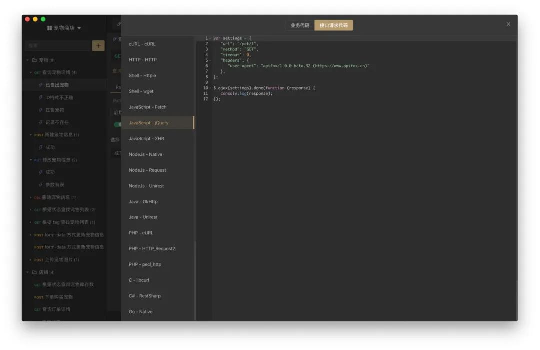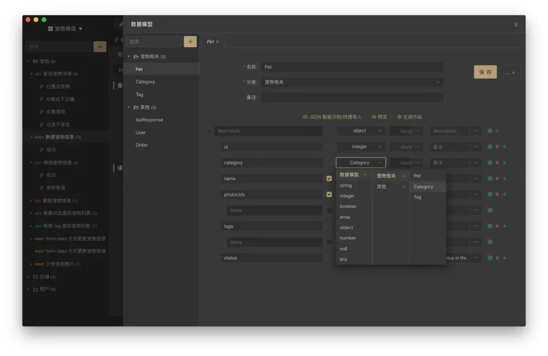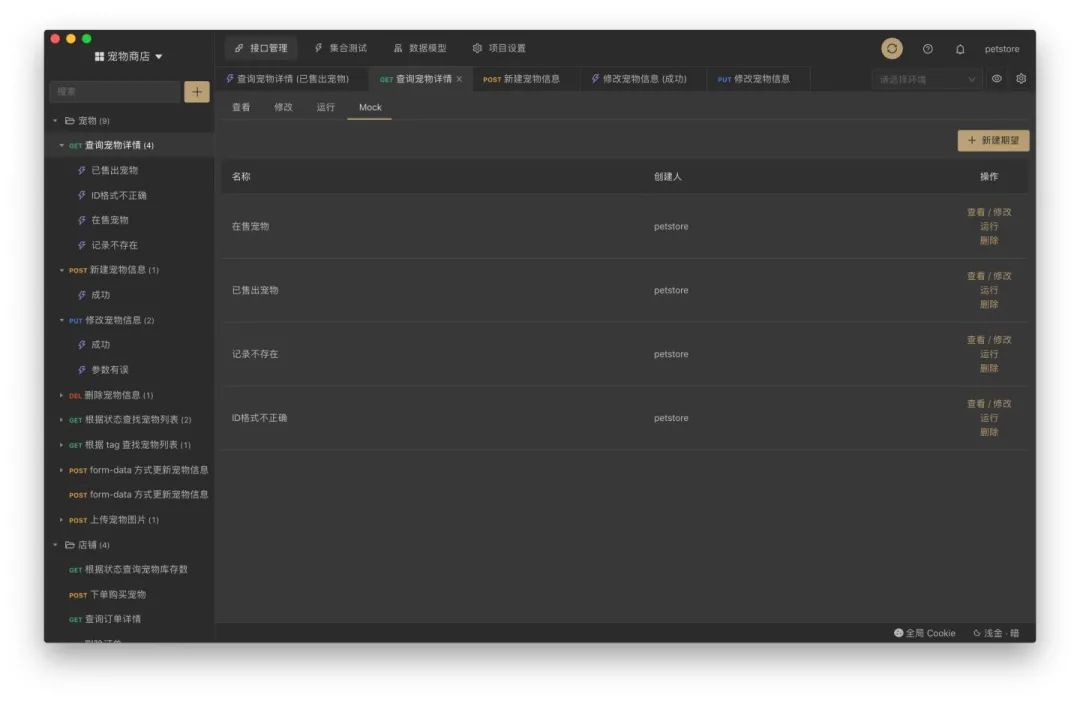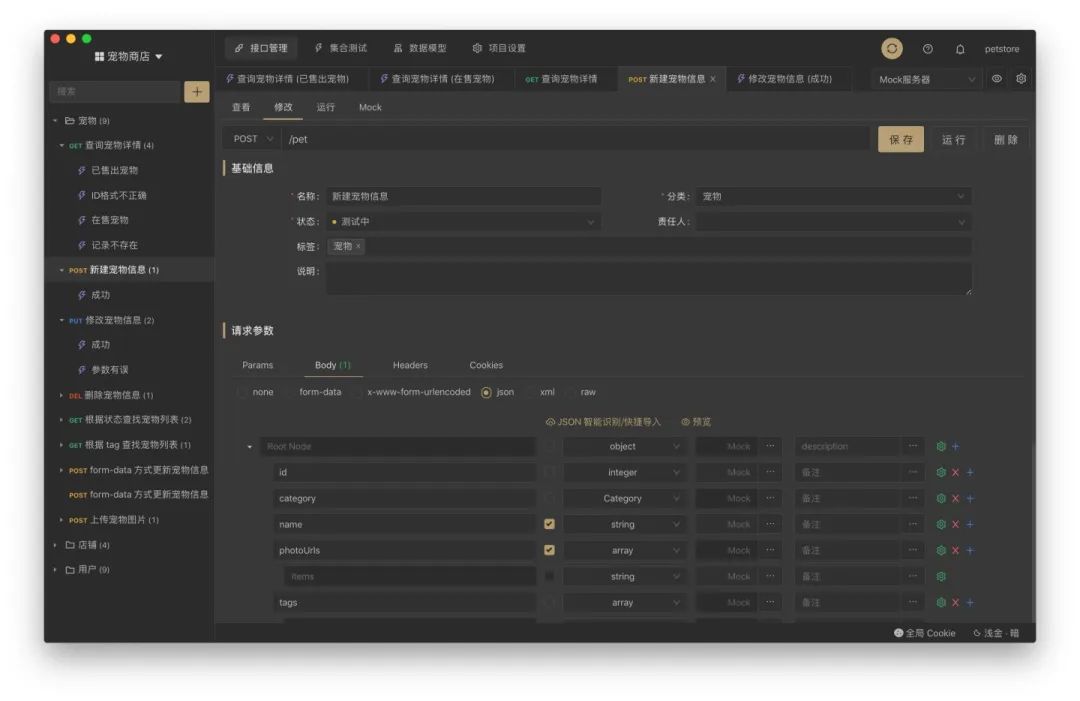 接口文档定义:Apifox 遵循 OpenApi 3.0 (原Swagger)、JSON Schema 规范的同时,提供了非常好用的可视化文档管理功能,零学习成本,非常高效。 接口调试:Postman 有的功能,比如环境变量、预执行脚本、后执行脚本、Cookie/Session 全局共享 等功能,Apifox 都有,并且和 Postman 一样高效好用。 数据 Mock:内置 Mock.js 规则引擎,非常方便 mock 出各种数据,并且可以在定义数据结构的同时写好 mock 规则。支持添加“期望”,根据请求参数返回不同 mock 数据。最重要的是 Apifox 零配置