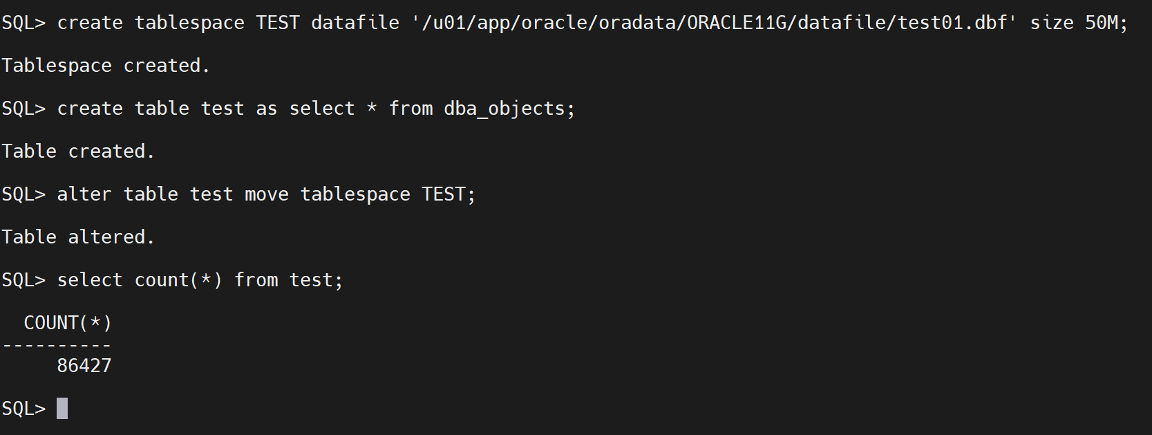 SQL>create tablespace TEST datafile '/u01/app/oracle/oradata/ORACLE11G/datafile/test01.dbf' size 50M;