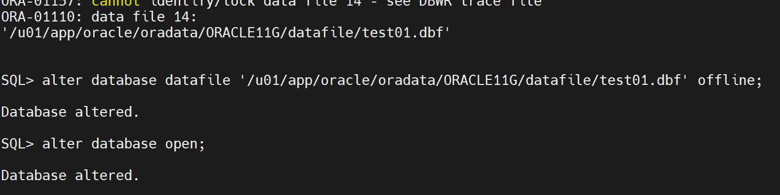 SQL>alter database datafile '/u01/app/oracle/oradata/ORACLE11G/datafile/test01.dbf' offline;