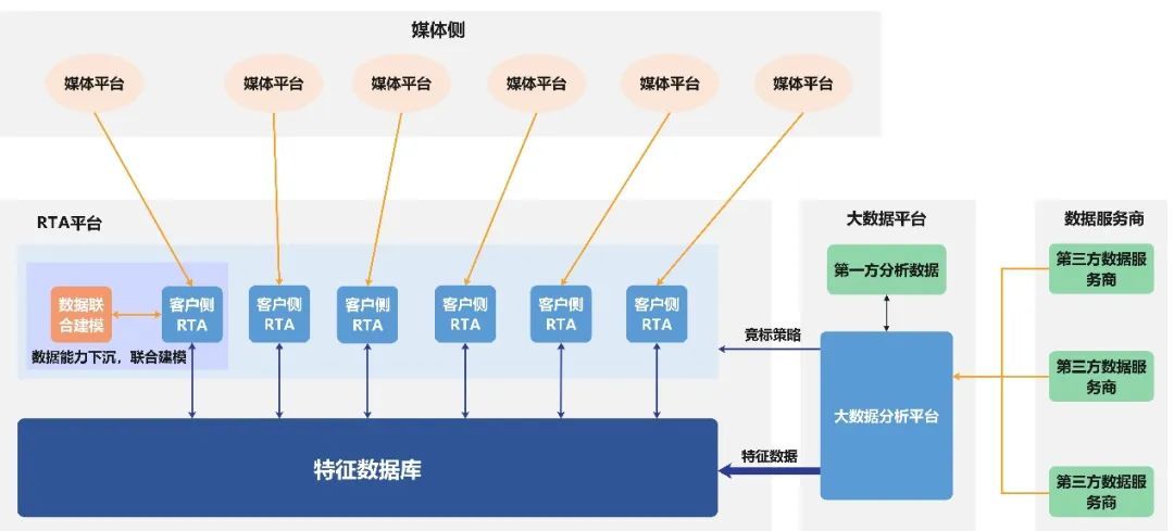 RTA业务平台对接多个流量巨头媒体推广平台。用户浏览社交媒体时,各媒体推广平台发起广告请求,RTA业务与特征数据库实时交互,获取目标用户的特征画像信息,基于投放策略分析并竞价返回;