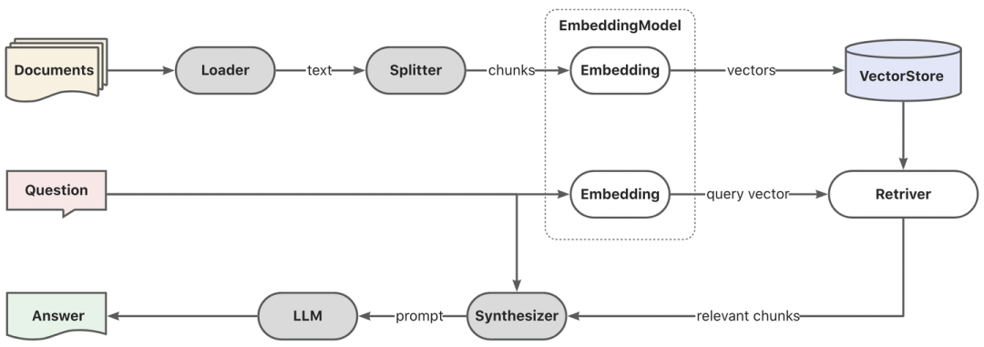 • 生成(文档上下文):Retriver检索的结果文档作为上下文和问题一起提交给大模型处理。