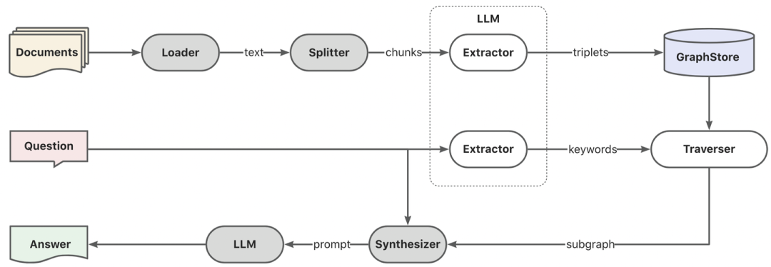 接口,目前提供了嵌入、抽取、翻译三类转换器。而图索引的构建,则通过三元组提取器TripletExtractor