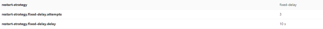 restart-strategy.fixed-delay.attempts 默认值 1 ,也就是默认重启1一次。请注意这个和没有配置重启策略的默认值不一样,没有配置策略,默认值为 Integer.MAX_VALUE。