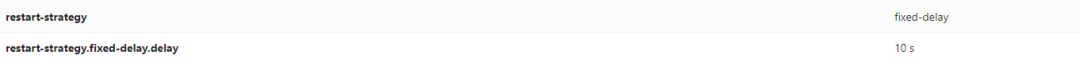 restart-strategy.fixed-delay.delay 默认值 1 s ,两次连续重新启动尝试之间的延迟时间。如:1 min 、 20 s