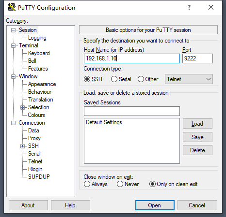 2.打开 putty,输入 TNAS的 IP地址和 ssh的端口,端口默认为9222。