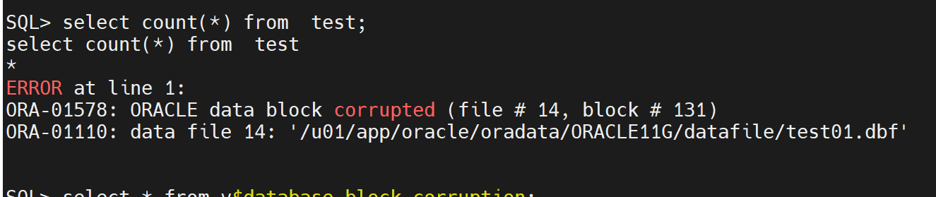查询v$database_block_corruption视图也提示还有其他坏块(可能是dd命令的问题,导致单块数据块损坏变成多块损坏)
