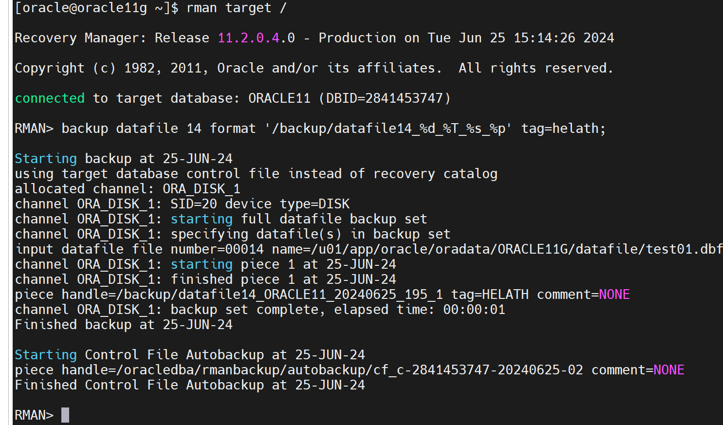 RMAN> backup datafile 14 format '/backup/datafile14_%d_%T_%s_%p' tag=helath;