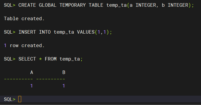 所以对于Oracle数据库而言,全局临时表的功能表现为会话间数据不共享,但表结构共享。