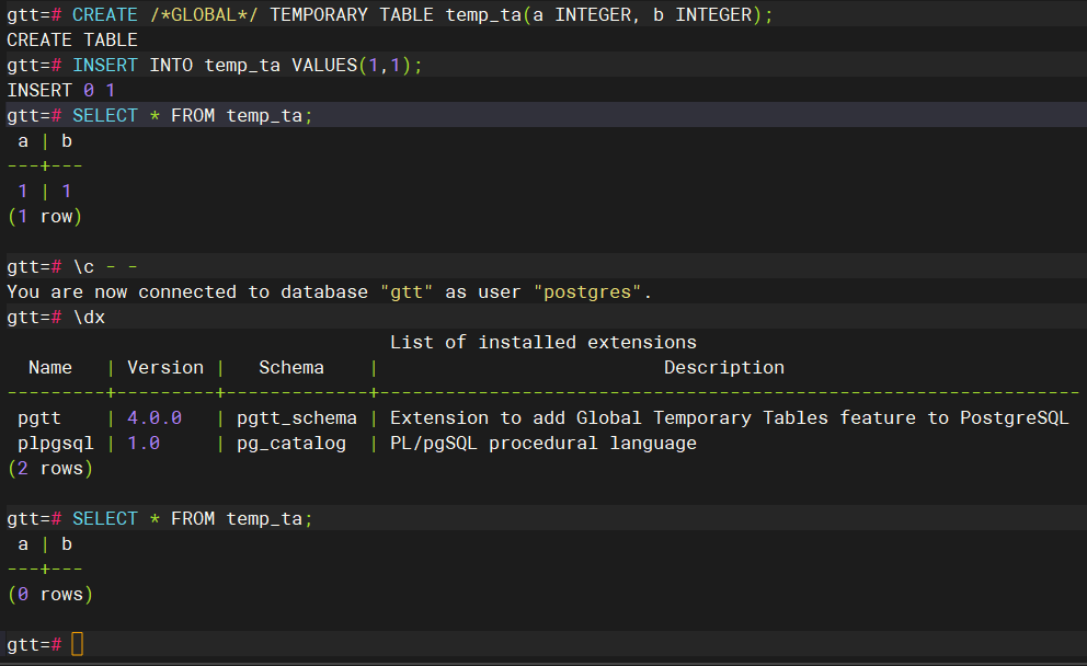 其实pgtt也是这么一个实现思路,当成功创建pgtt拓展的时候,会附加上表 pgtt_schema.pg_global_temp_tables,这张表将用作存储全局临时表的数据信息。