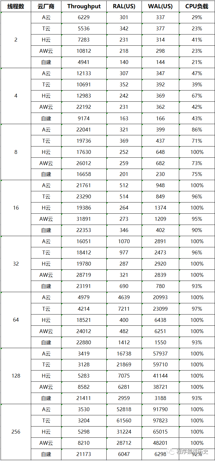 每秒操作数一开始随着线程数的增加而增大,到达一定线程数后,每秒线程数下降。最大值均出现在16个线程时。 当线程数到达16时,各家云厂商的产品CPU负载均到达了95%以上。 当线程数到达32时,平均RT是负载较低时的10倍左右。 50%写50%读场景,数据库每秒操作数降低了2倍左右,RT也增长了2倍左右。 自建的MongoDB在性能上,和同规格的阿里云、腾讯云并没有太大差异,性能基本相同。