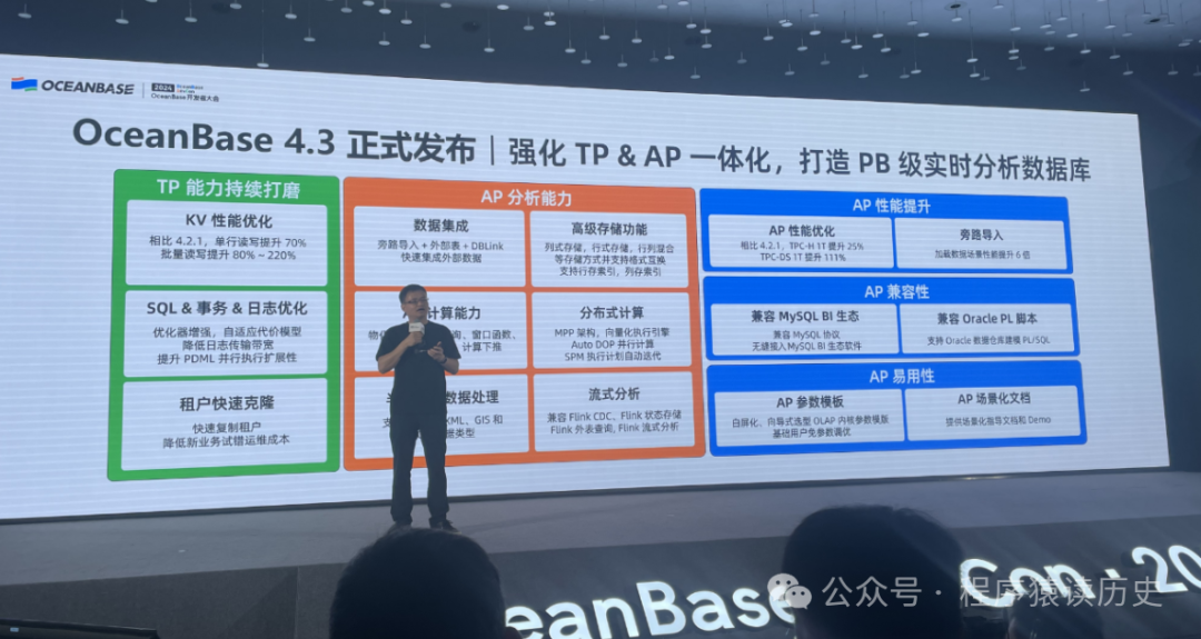 这次开发者大会 OceanBase 正式发布 4.3 版本,强化 TP & AP 一体化,打造 PB 级实时分析数据库,将事务处理(OLTP)和分析处理(OLAP)融合到同一个数据库系统中,为企业提供了更全面、更高效的数据处理能力。