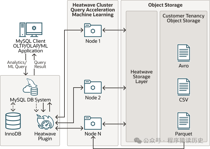 传统的 OLTP 场景,它的数据读写方式和访问单机 MySQL 没有变化。而 一些 OLAP 场景语句,会访问 HeatWave 引擎上,它的数据是以列方式存储,并在内部结合多核和SIMD向量处理,显著提高了分析场景下的性能。