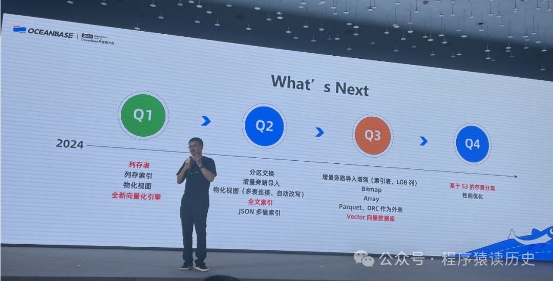 再话说回本次 OceanBase 开发者大会,会上OceanBase CTO 日照也公布了未来OB的 Roadmap,未来OB将会加强列存表、向量引擎、全文搜索、基于S3 的存算分离等能力。这与现在的 AI4DB 或者 DB4AI 趋势很吻合,可以看见 OceanBase 即将成为六边形全能战士。
