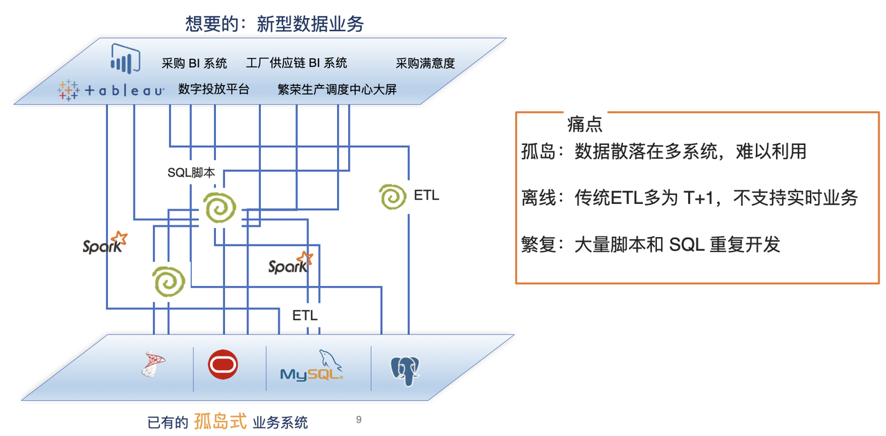 系统孤岛问题严重:数据分散在多个系统中,形成了数据孤岛,难以实现数据的统一管理和高效利用。传统的 ETL(Extract, Transform, Load)方式多为 T+1,不能支持实时业务需求,导致业务响应滞后。