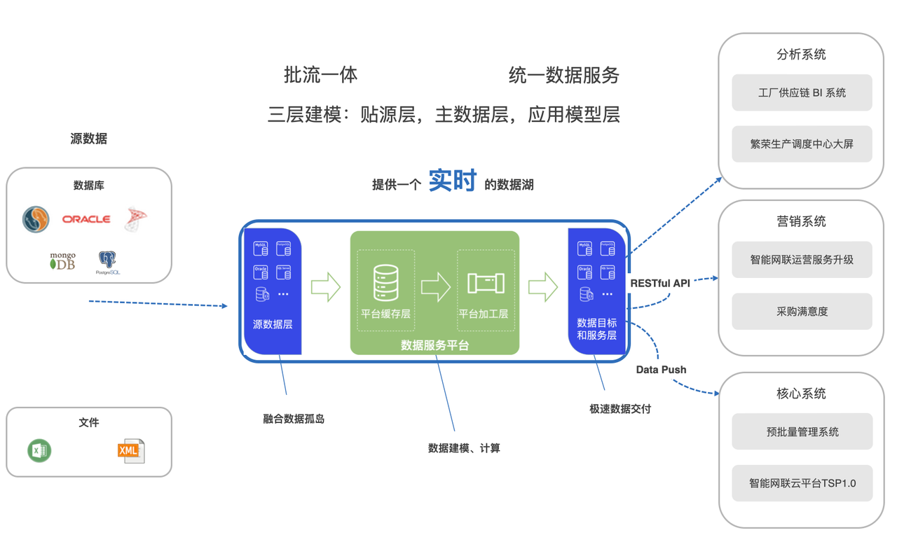 API发布和数据推送:利用数据接口,发布清洗和处理后的数据,并通过数据推送(例如基于消息队列或实时流的推送机制)将数据快速交付到各下游业务系统(如 BI 系统、营销系统、核心系统等),确保数据的及时交付和使用,支持实时决策和运营。