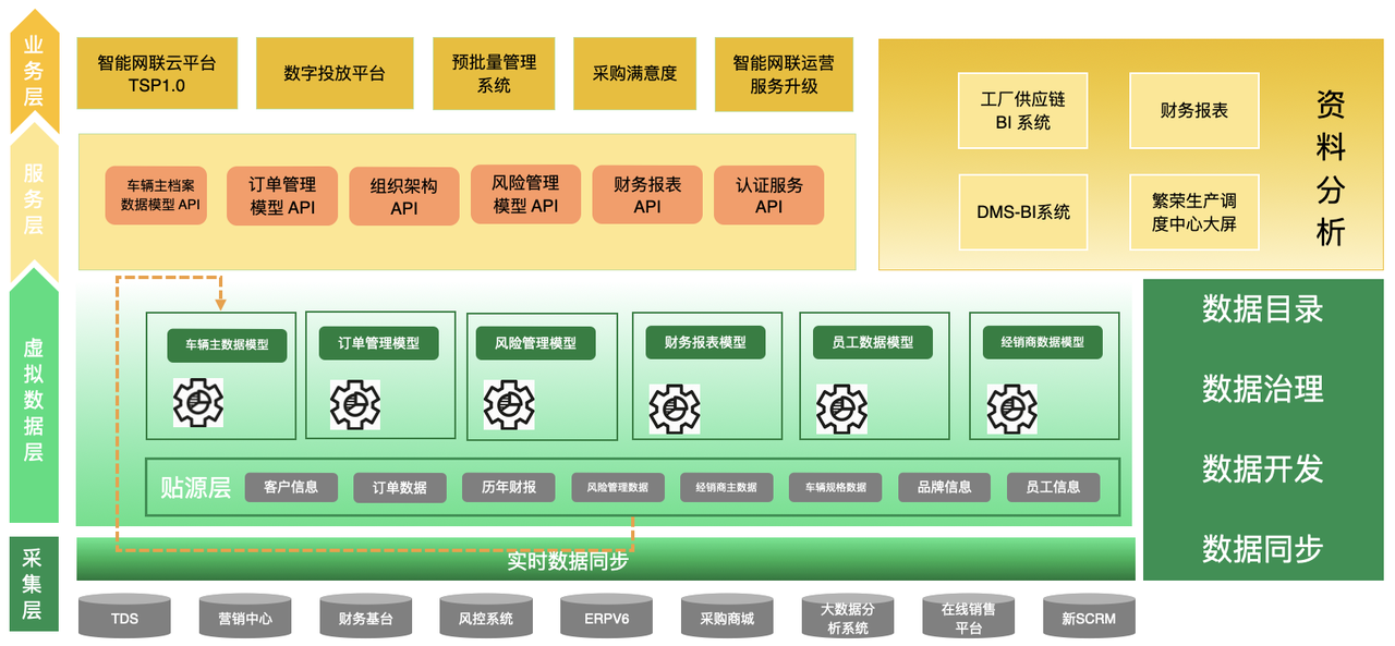 该架构通过将不同的数据源整合到虚拟数据层,利用服务层提供 API 接口,支持上层业务系统的各种需求,实现了数据的实时同步和高效利用。从而支持企业复杂的业务需求,确保数据的一致性、准确性和实时性。