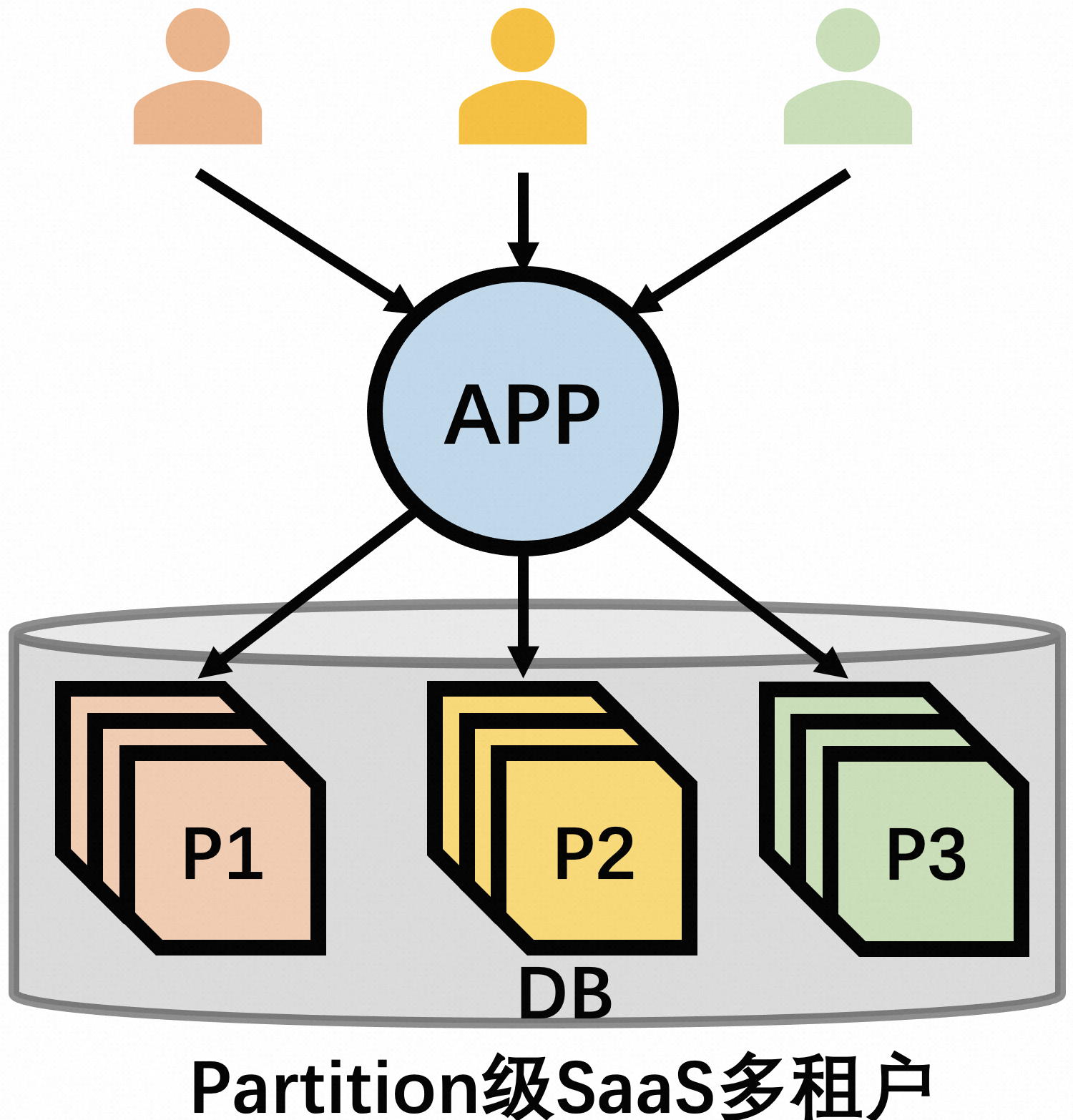 - Partition 级 SaaS 多租户,是指一个租户会对应一个Table的一个或多个的分区(或是一个Table的一部分 rows),不同租户的Parittion会分布在不同的机器上(如上图2所示),以实现资源隔离,该方案比较适用于不同租户需要使用统一Schema运行的场景。