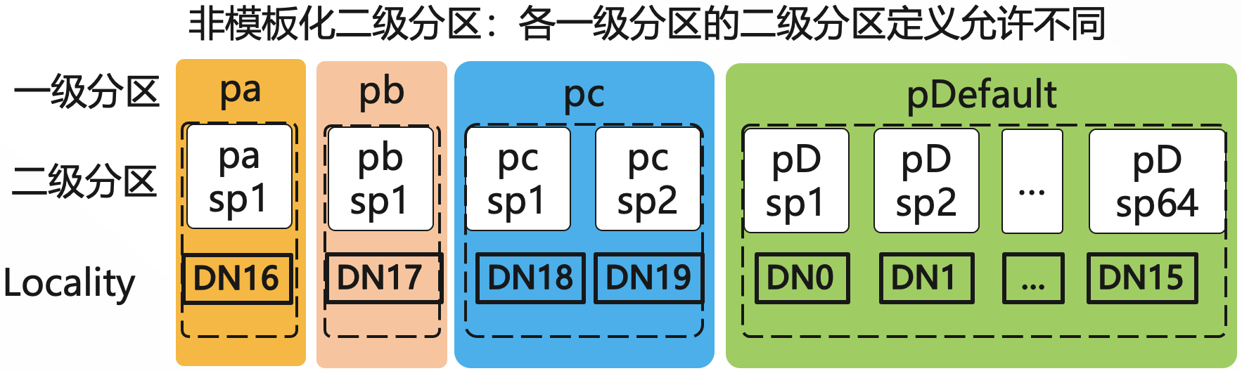 );。如上图所示,通过 Locality 对各个一级分区的DN节点资源的绑定,pa、pb、pc这3个大品牌的租户被分别配了DN16、DN17 与 DN18~DN19 3组的节点资源,而中小卖家池的 pDefault 分区则被绑定了16个DN节点。