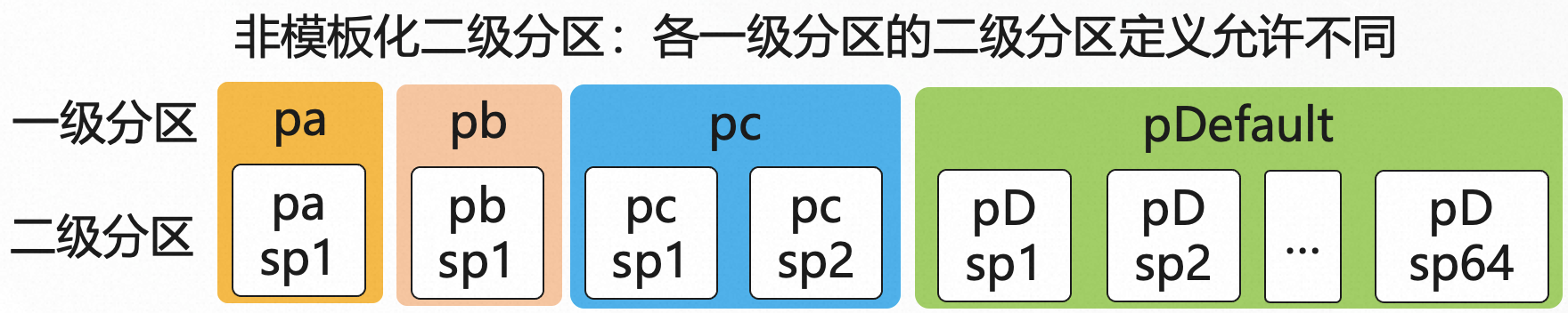 所谓的非模板化二级分区,就是各个一级分区之下的二级分的分区数目及其边界值定义允许不一致,如下所示: