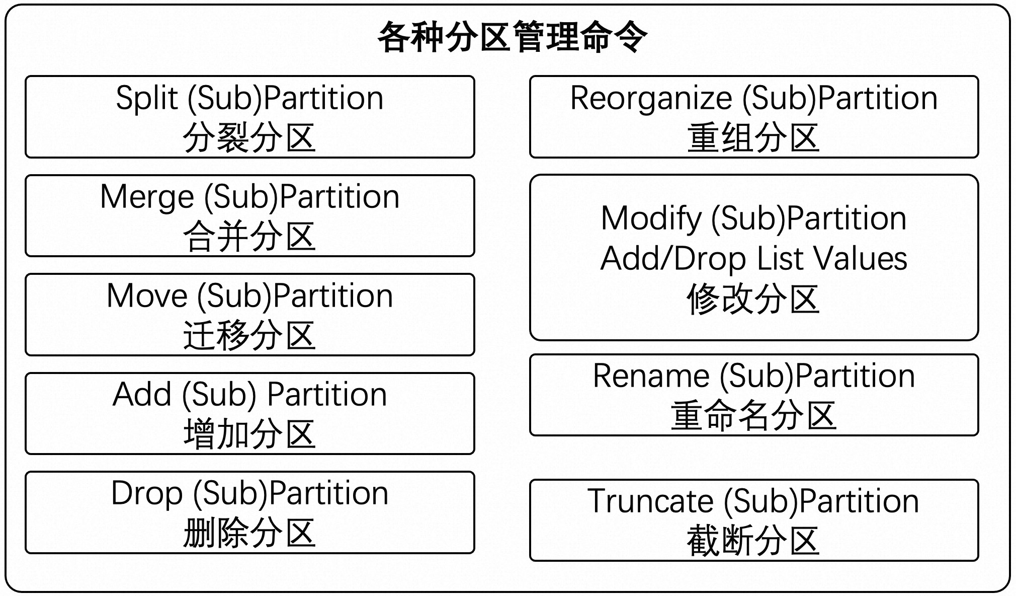 PolarDB-X 2.0 对于分区表提供了一系列完备的灵活强大的分区管理命令(如下图所示),让用户能够仅仅通过简单SQL命令,就可以实现在多租户场景下的不同运维变更的诉求。