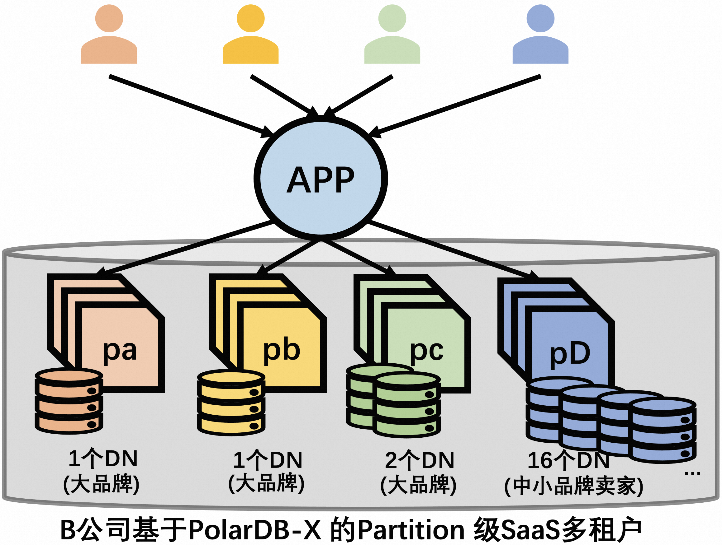 PolarDB-X 的分区表及 Locality 的 SaaS 级多租户能力,对于诸如B公司这类订单管理平台,除了能满足其对品方的数据隔离与资源隔离的诉求外,还可以为业务提供更多的数据查询的能力。