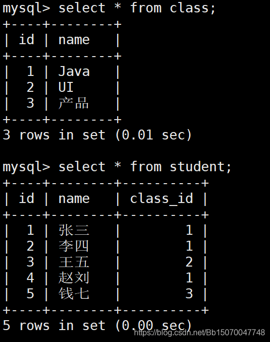 DROP TABLE IF EXISTS `class`; CREATE TABLE `class` ( `id` int(11) NOT NULL AUTO_INCREMENT, `name` varchar(30) DEFAULT NULL, PRIMARY KEY (`id`) ) ENGINE=InnoDB AUTO_INCREMENT=4 DEFAULT CHARSET=utf8; insert into `class`(`id`,`name`) values (1,'Java'), (2,'UI'), (3,'产品'); DROP TABLE IF EXISTS `student`; CREATE TABLE `student` ( `id` int(11) NOT NULL AUTO_INCREMENT, `name` varchar(20) DEFAULT NULL, `class_id` int(11) DEFAULT NULL, PRIMARY KEY (`id`) ) ENGINE=InnoDB AUTO_INCREMENT=6 DEFAULT CHARSET=utf8; /*Data for the table `student` */ insert into `student`(`id`,`name`,`class_id`) values (1,'张三',1), (2,'李四',1), (3,'王五',2), (4,'赵刘',1), (5,'钱七',3);