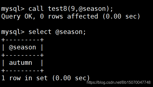 call test8(9,@season); -- 定义会话变量来接收test8存储过程返回的值