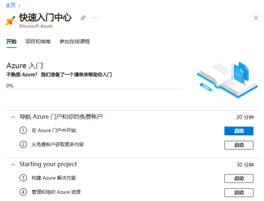 为了帮您快速熟悉 Azure,您可以跟随网页指南快速掌握 Azure(推荐)。您也可以点击页面左上角的[主页]或者右上角的[X]关闭 [快速入门中心] ,直接进入 [Azure 门户]。