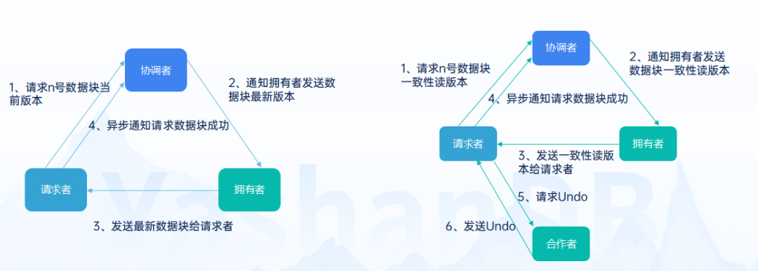 一次典型的数据块访问,需要三个角色配合完成,请求结束后请求者变成新的拥有者。