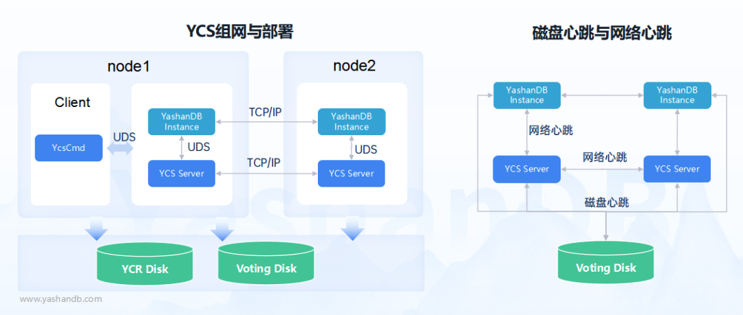 YCS通过共享存储YCR盘获取集群的节点、资源信息等,并与其他节点建立通信,管理资源等。同时各节点的YCS通过定期读写Voting Disk进行磁盘心跳。