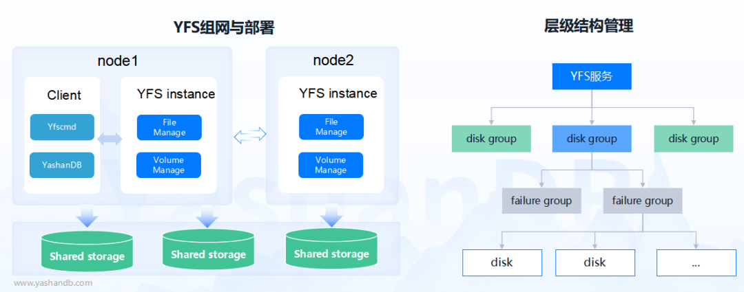 在共享集群部署模式下,YFS管理挂载在各集群节点的共享磁阵,对外提供一致和高效的文件管理接口。