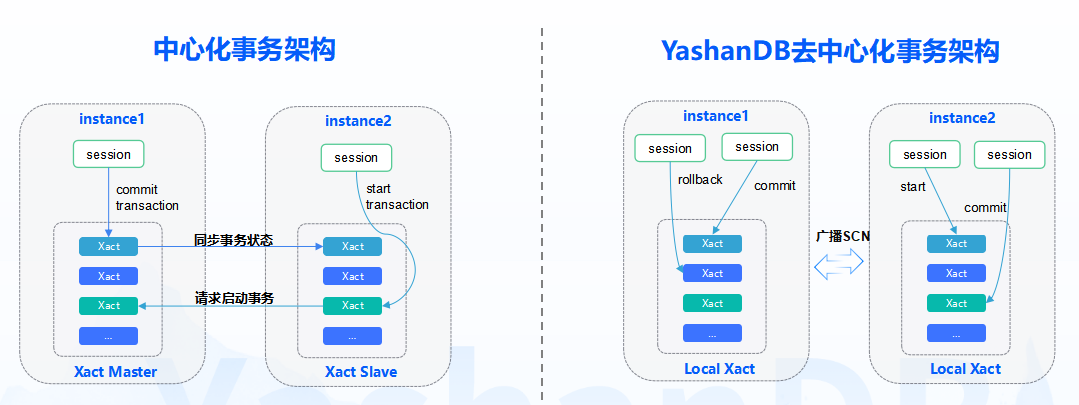 YashanDB采用的是去中心化的事务设计,其特点如下: