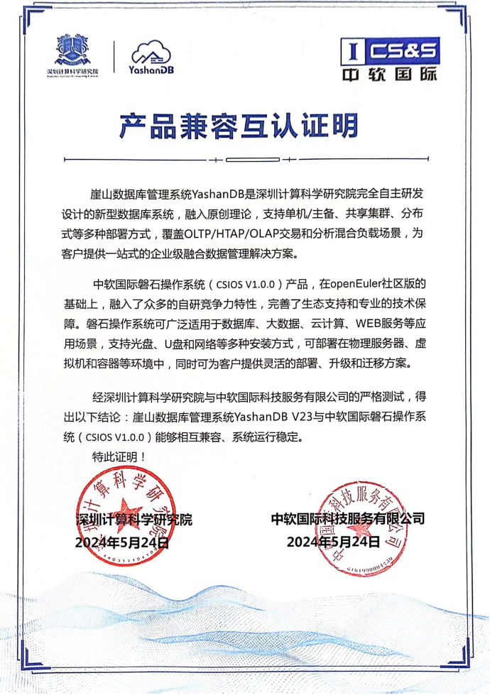 近日,深圳计算科学研究院崖山数据库系统YashanDB与中软国际磐石操作系统顺利完成兼容性互认证。经严格测试,双方产品完全兼容,稳定运行,为企业级用户的业务应用提供了更加稳定、安全、高效的基础软件运行环境,加速信息技术产业的国产化进程。
