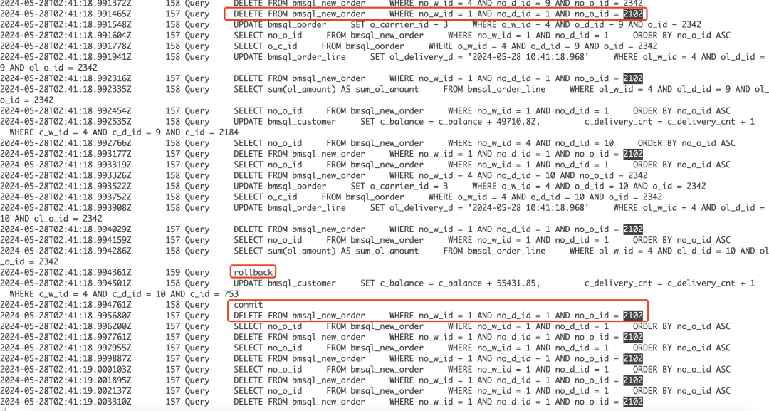 | DELETE FROM bmsql_new_order WHERE no_w_id = 1 AND no_d_id = 1 AND no_o_id = 2543; | DELETE FROM bmsql_new_order WHERE no_w_id = 1 AND no_d_id = 1 AND no_o_id = 2543; # 锁等待 |