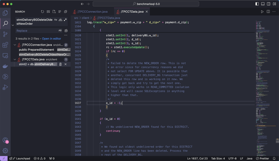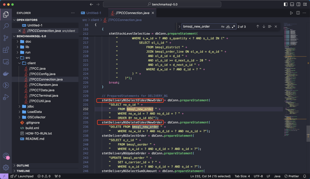 执行以上命令,可以定位到事务 SQL 的代码在 ./client/jTPCCConnection.java